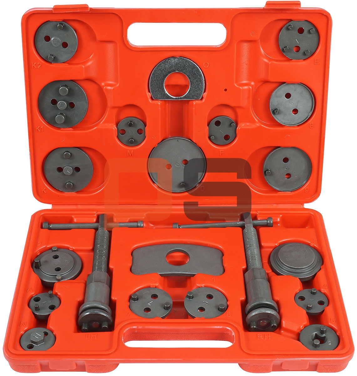 Profesjonalny 21 elementowy zestaw do cofania / wyciskania tłoczków w cylinderkach układów hamulcowych, niezbędny przy naprawach pojazdów wyposażonych w hamulce tarczowe. Pokrętło wyposażone jest w magnetyczną końcówkę, dzięki temu utrzymuje talerzyk odpowiadający danemu tłoczkowi w osi. Zestaw przeznaczony jest dla każdego warsztatu samochodowego, gdzie pomaga przyspieszyć serwisowanie układów hamulcowych.
