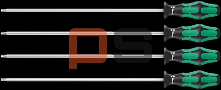 4-częściowy zestaw wkrętaków z rękojeścią Kraftform, która zapewnia przyjemną i ergonomiczną pracę chroniąc dłoń przed powstawaniem pęcherzy i odcisków. Twarde strefy chwytu umożliwiają szybkie pokręcanie, miękkie strefy zapewniają przenoszenie wysokich momentów obrotowych. Z systemem wyszukiwania narzędzi "Take it easy": oznaczenie kolorystyczne rozmiaru. 6-kątny kołnierz zapobiegający staczaniu się narzędzia.
